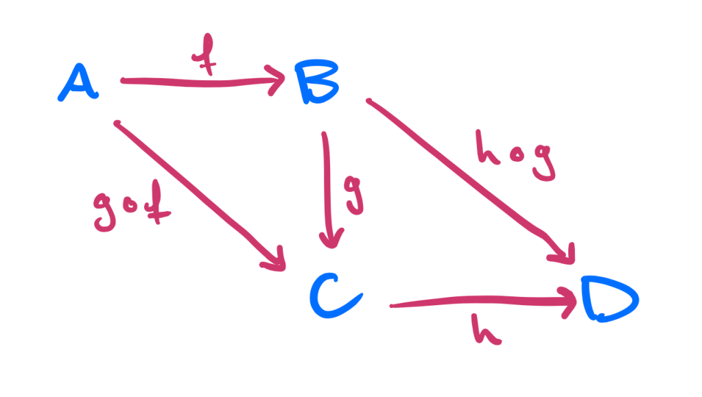 These identity arrows are important to our categorical idea of sameness explained later but the meaning of such non-movements is that moving from one object to another and then take staying in place is equal to just the first movement. The final rule is that we can take any path like in the diagram below